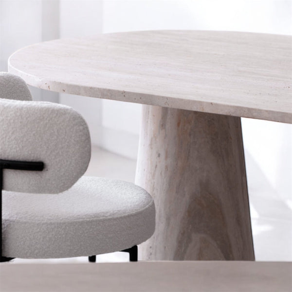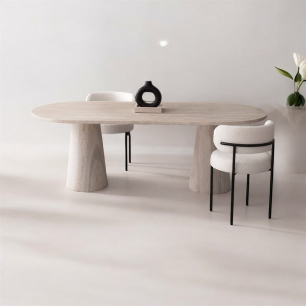 Notre table IZA avec son plateau gélule et ses pieds coniques. en travertin naturel réunie qualité et élégance . Son design intemporelle sera idéale pour vos repas en famille ou entre amis et saura habillé avec facilité n’importe quel intérieur . Hauteur 75cm