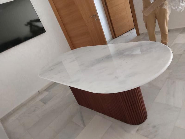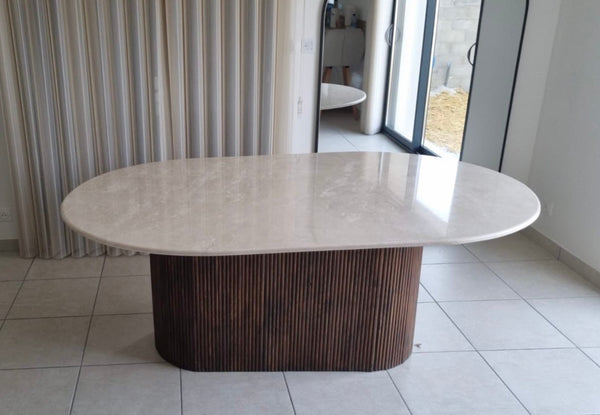 Table pied centrale en bois en marbre ou en travertin. Possibilité de choisir un autre marbre sur commande.