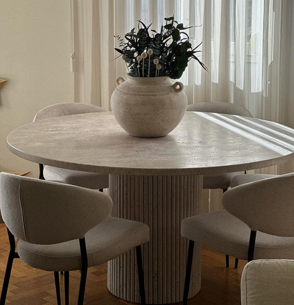 Table ronde travertin avec pieds tasseaux classique. Épaisseur du plateau 3cm. Hauteur : 75cm.