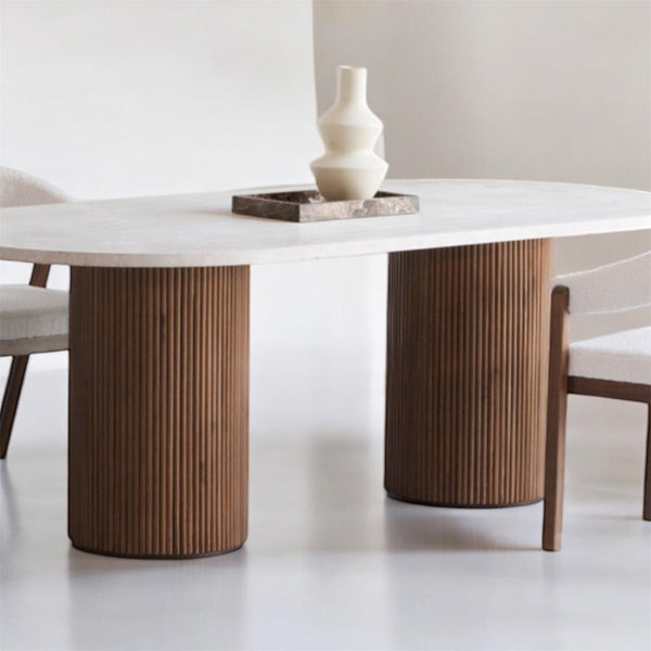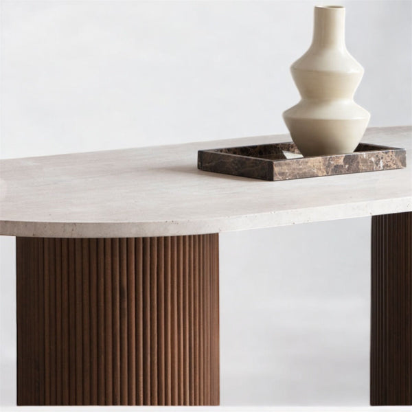 Notre table TALBU allie travertin et noyer pour un rendu élégant et épuré . Elle habillera avec merveille votre salle a manger . Hauteur 76cm